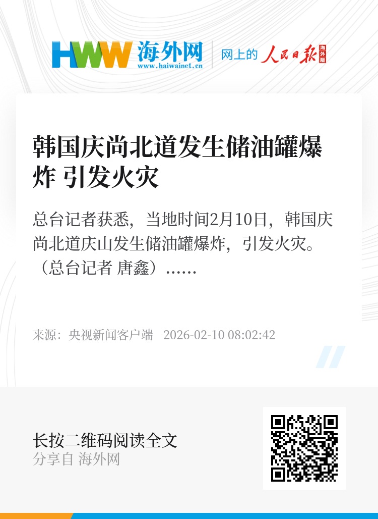 总台记者获悉,当地时间2月10日,韩国庆尚北道庆山发生储油罐爆炸,引发火灾。(总台记者 唐鑫)