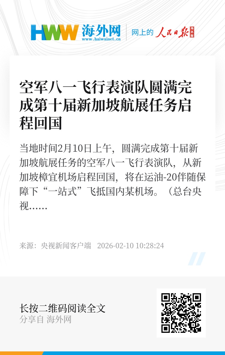 当地时间2月10日上午,圆满完成第十届新加坡航展任务的空军八一飞行表演队,从新加坡樟宜机场启程回国,将在运油-20伴随保障下“一站式”飞抵国内某机场。(总台央视记者 谭琳)