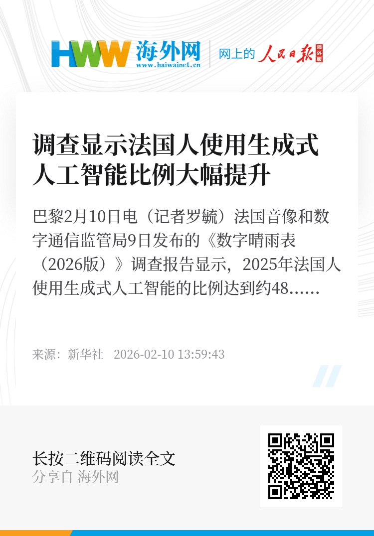 新华社巴黎2月10日电(记者罗毓)法国音像和数字通信监管局9日发布的《数字晴雨表(2026版)》调查报告显示,2025年法国人使用生成式人工智能的比例达到约48%,较2024年33%的比例有大幅提升。在18至24岁的年轻人群体中,这一比例甚至高达85%。