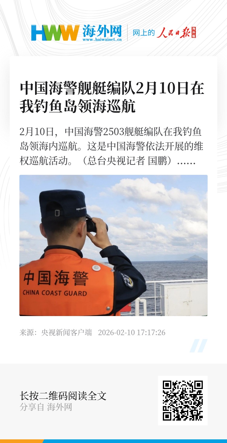 2月10日,中国海警2503舰艇编队在我钓鱼岛领海内巡航。这是中国海警依法开展的维权巡航活动。