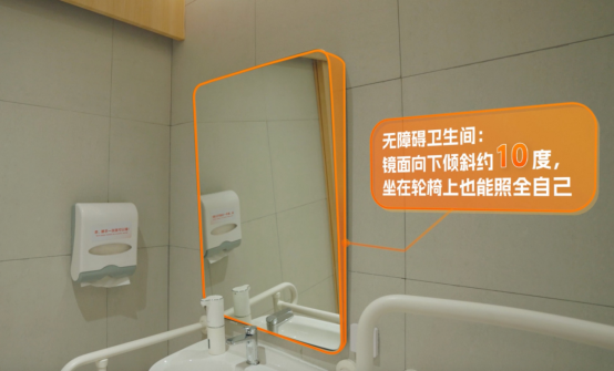 (阿里全球访客中心内共有9个设施齐全的无障碍卫生间,专门配备了向下倾斜10度的镜子)