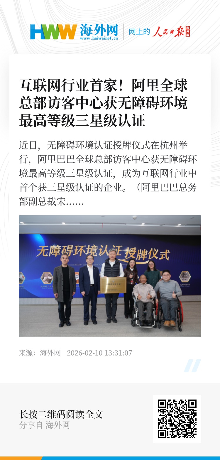 近日,无障碍环境认证授牌仪式在杭州举行,阿里巴巴全球总部访客中心获无障碍环境最高等级三星级认证,成为互联网行业中首个获三星级认证的企业。