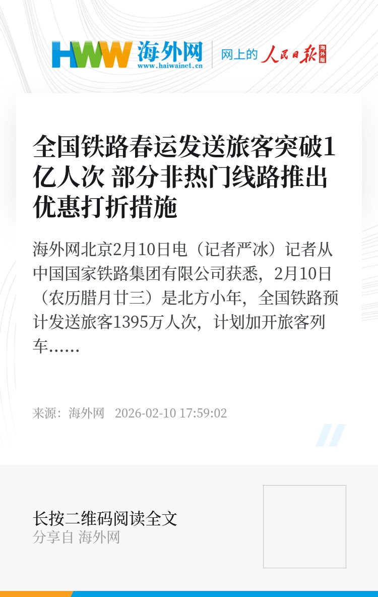 海外网北京2月10日电(记者严冰)记者从中国国家铁路集团有限公司获悉,2月10日(农历腊月廿三)是北方小年,全国铁路预计发送旅客1395万人次,计划加开旅客列车1363列。2月9日,全国铁路发送旅客1435.5万人次,2月2日春运启动以来累计发送旅客1.01亿人次,运输安全平稳有序。
