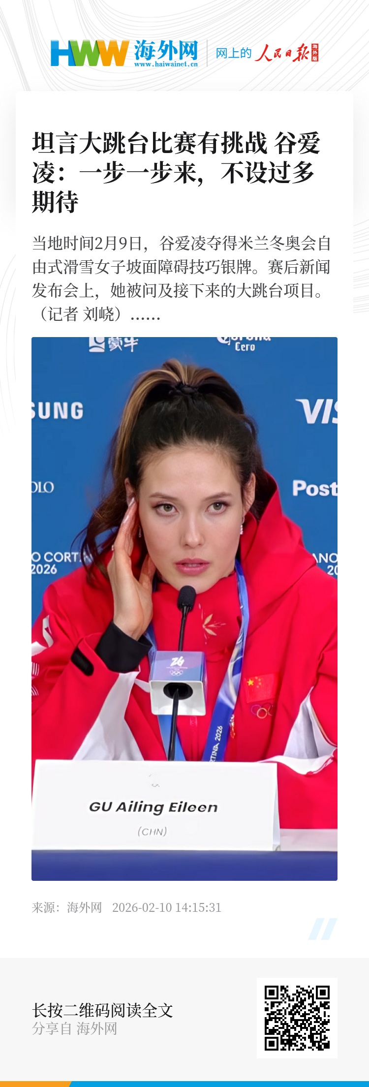 当地时间2月9日,谷爱凌夺得米兰冬奥会自由式滑雪女子坡面障碍技巧银牌。赛后新闻发布会上,她被问及接下来的大跳台项目。(记者 刘峣)