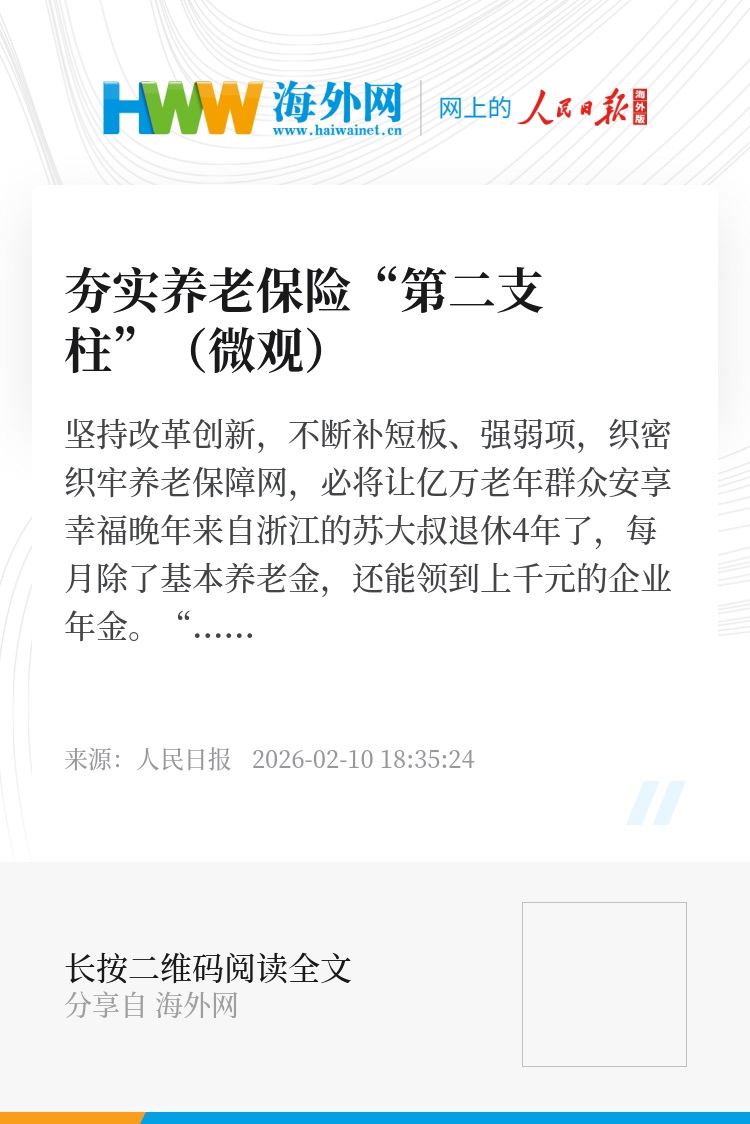 民生无小事,枝叶总关情。“十五五”规划建议提出,加快发展多层次、多支柱养老保险体系。2025年末,我国65岁及以上人口超过2.2亿,占总人口的15.9%。应对我国老龄化程度进一步加深的挑战,养老保障体系建设时不我待。从完善并落实基本养老保险全国统筹制度,到进一步扩大企业年金覆盖范围,再到丰富个人养老金产品……坚持改革创新,不断补短板、强弱项,织密织牢养老保障网,必将让亿万老年群众安享幸福晚年。(韩春瑶)
