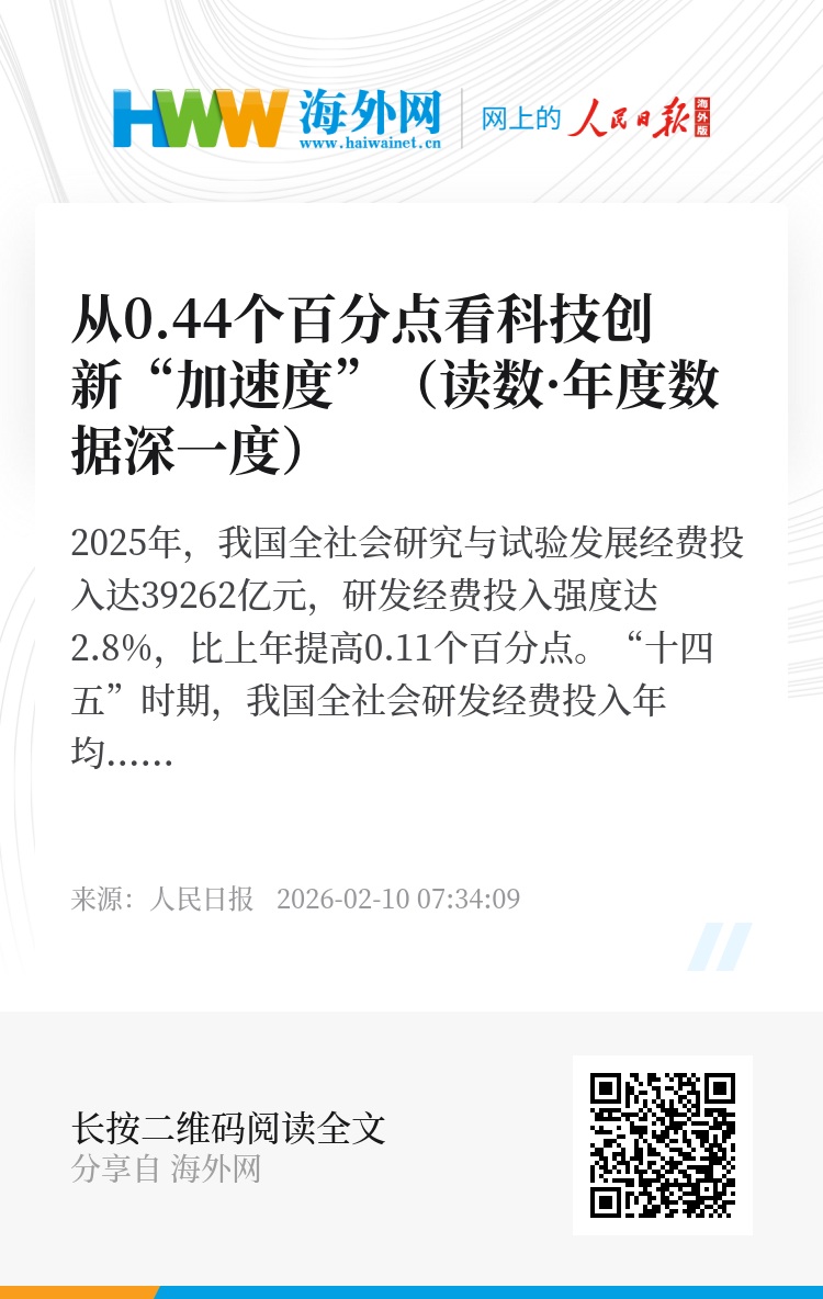 2025年,我国全社会研究与试验发展经费投入达39262亿元,研发经费投入强度达2.8%,比上年提高0.11个百分点。“十四五”时期,我国全社会研发经费投入年均增长10%,研发经费投入强度提高0.44个百分点。