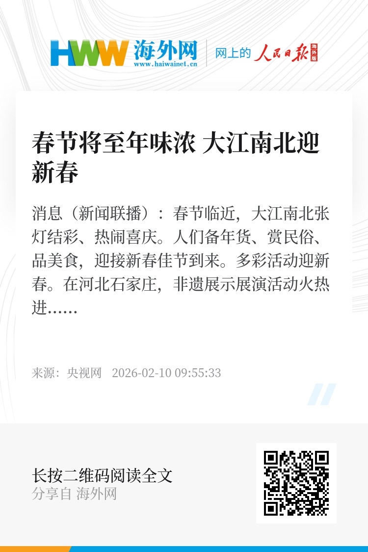 多彩活动迎新春。在河北石家庄,非遗展示展演活动火热进行。现场锣鼓喧天、龙腾虎跃,红脸社火、大秧歌等轮番登场,引来阵阵掌声和喝彩声;剪纸、漆画、木雕等传统手工艺精巧别致,令市民、游客赞叹不已。在安徽颍上,民俗踩街表演热闹非凡,颍上花鼓灯、跑旱船等精彩表演,吸引市民、游客驻足观看、拍照留念。在山东博兴,人们打起腰鼓,扭起秧歌,在舞龙舞狮的喜庆氛围中迎春接福。在浙江杭州临江街道,新春游园会上捏面人、写春联、拍全家福等趣味活动让大家沉浸其中。在江苏靖江季市古镇,人们逛古镇、看演出,体验丰富多彩的非遗项目和民俗文化。
