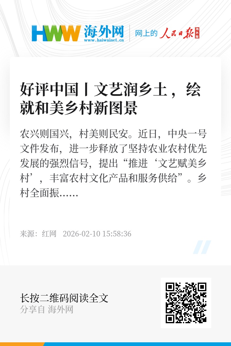 农兴则国兴,村美则民安。近日,中央一号文件发布,进一步释放了坚持农业农村优先发展的强烈信号,提出“推进‘文艺赋美乡村’,丰富农村文化产品和服务供给”。乡村全面振兴既要物质丰饶,更要精神充盈,让文艺繁花绽放在和美乡村的沃土上,关键要让文艺扎根泥土、融入生活、赋能产业,使文化成为乡村发展的内生动力。