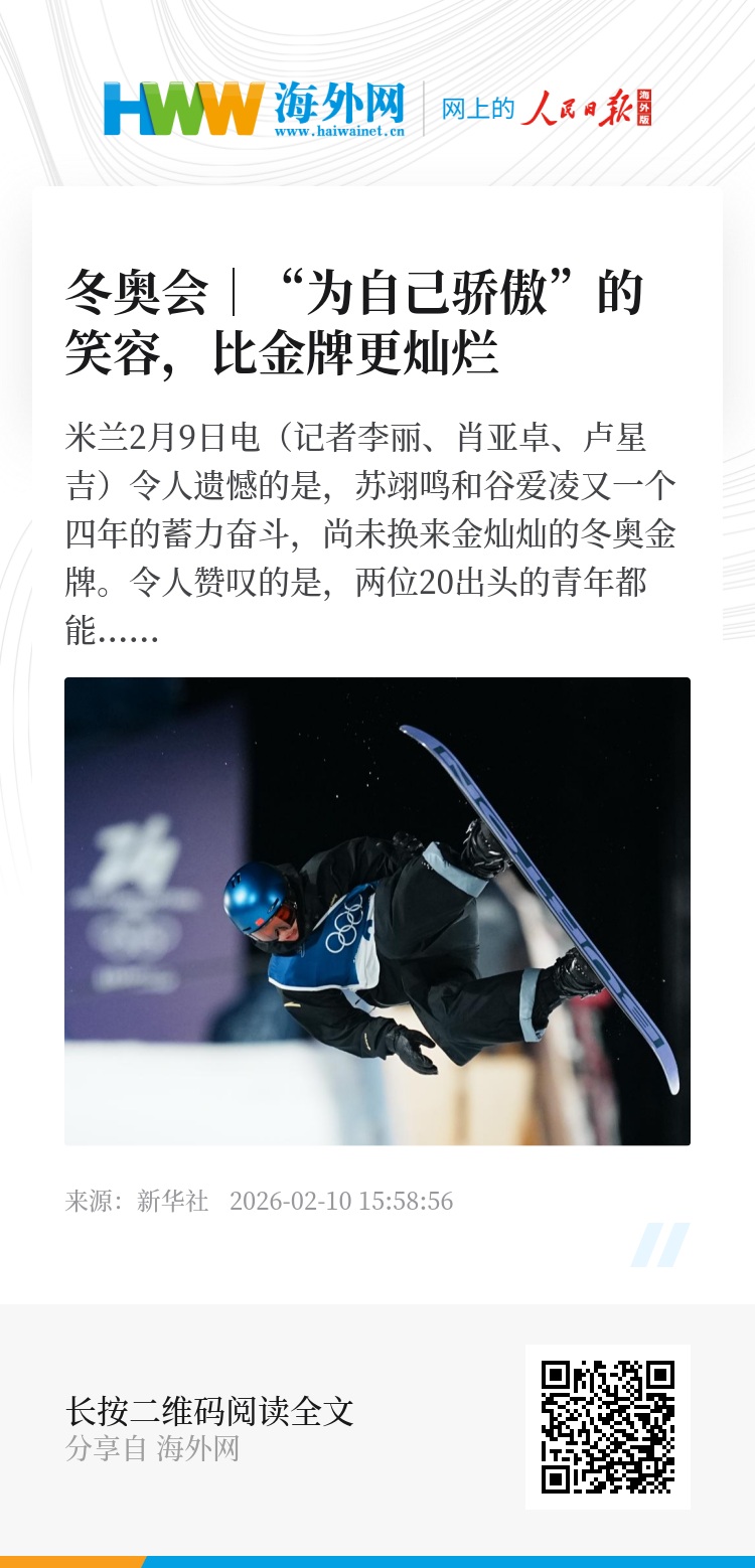 新华社米兰2月9日电(记者李丽、肖亚卓、卢星吉)令人遗憾的是,苏翊鸣和谷爱凌又一个四年的蓄力奋斗,尚未换来金灿灿的冬奥金牌。