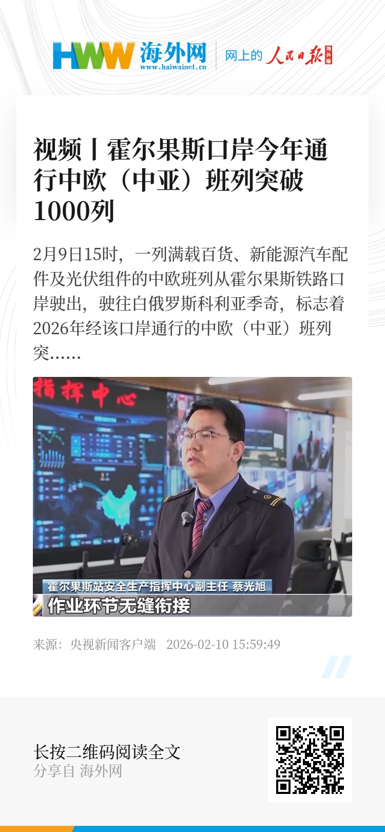 霍尔果斯站安全生产指挥中心副主任 蔡光旭:通过精准车流预报、作业环节无缝衔接,确保日班计划的高质量兑现,为全年运输上量开了好头。
