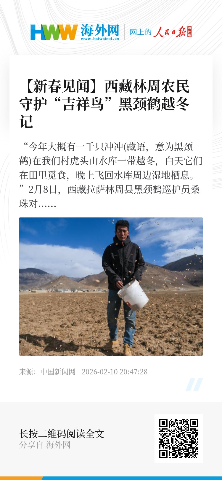 黑颈鹤是中国国家一级保护动物,是唯一生活、繁殖在高原的鹤类,被藏族民众誉为“吉祥鸟”。据西藏自治区官方介绍,近年来高原黑颈鹤种群数量持续增长。2025年2月,黑颈鹤被选为拉萨市“市鸟”,更凸显了其在当地生态系统和文化中的重要地位。