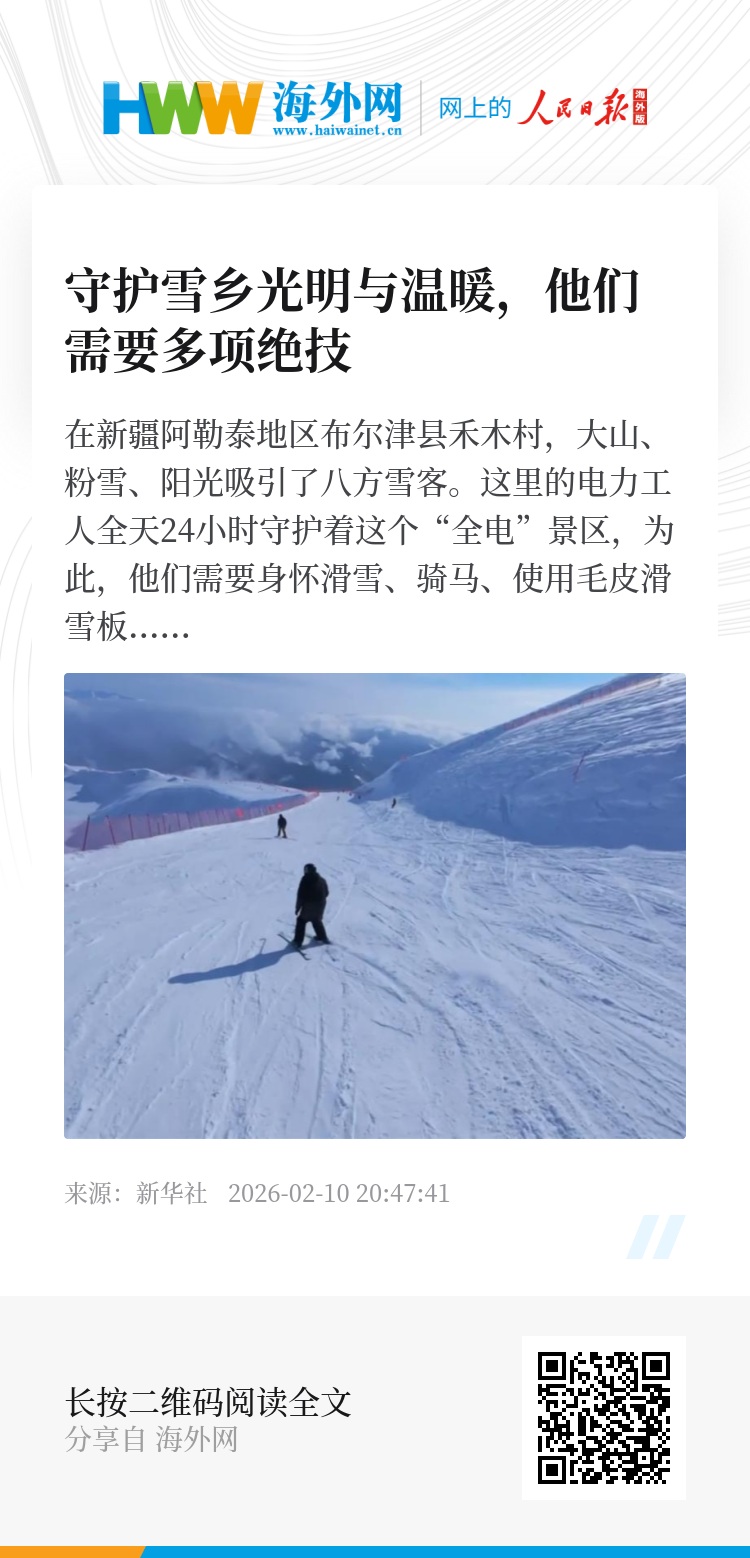 在新疆阿勒泰地区布尔津县禾木村,大山、粉雪、阳光吸引了八方雪客。这里的电力工人全天24小时守护着这个“全电”景区,为此,他们需要身怀滑雪、骑马、使用毛皮滑雪板等多项绝技。