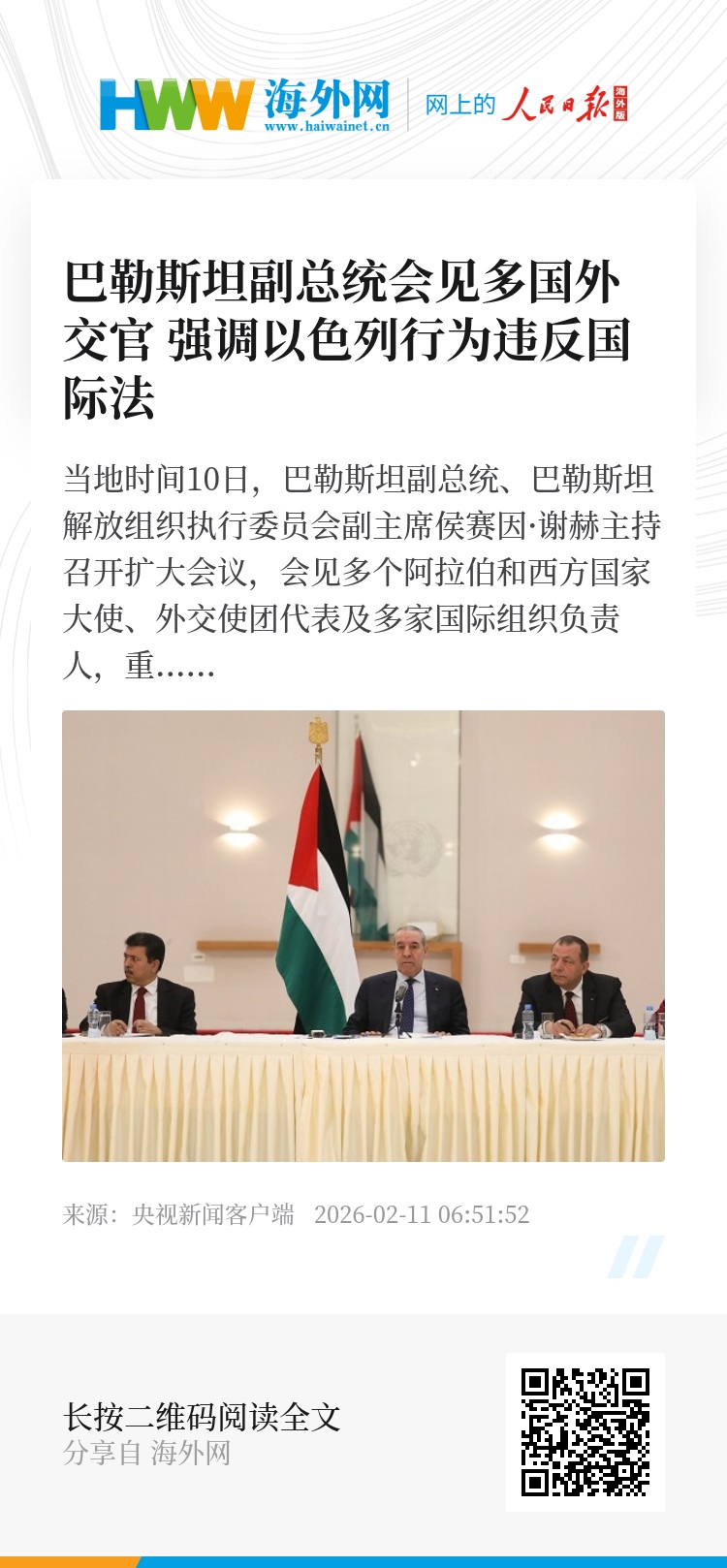 谢赫强调,巴勒斯坦方面正推进民主建设,包括举行各级选举、推进改革、打击腐败和起草宪法,以推动从“权力机构”向“国家”过渡。他指出,以色列内阁近期作出的决定明显背离既有协议,破坏国际公约,将严重影响地区安全与稳定。他呼吁国际社会承担法律和道义责任,对以色列施加有效压力,要求其停止侵害行为,尊重国际法和巴勒斯坦国主权。(总台记者 赵兵)