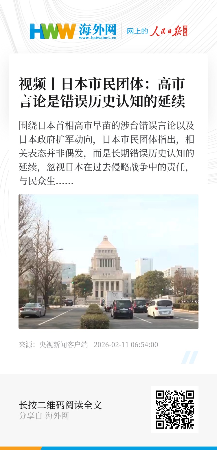 围绕日本首相高市早苗的涉台错误言论以及日本政府扩军动向,日本市民团体指出,相关表态并非偶发,而是长期错误历史认知的延续,忽视日本在过去侵略战争中的责任,与民众生活现实背道而驰。