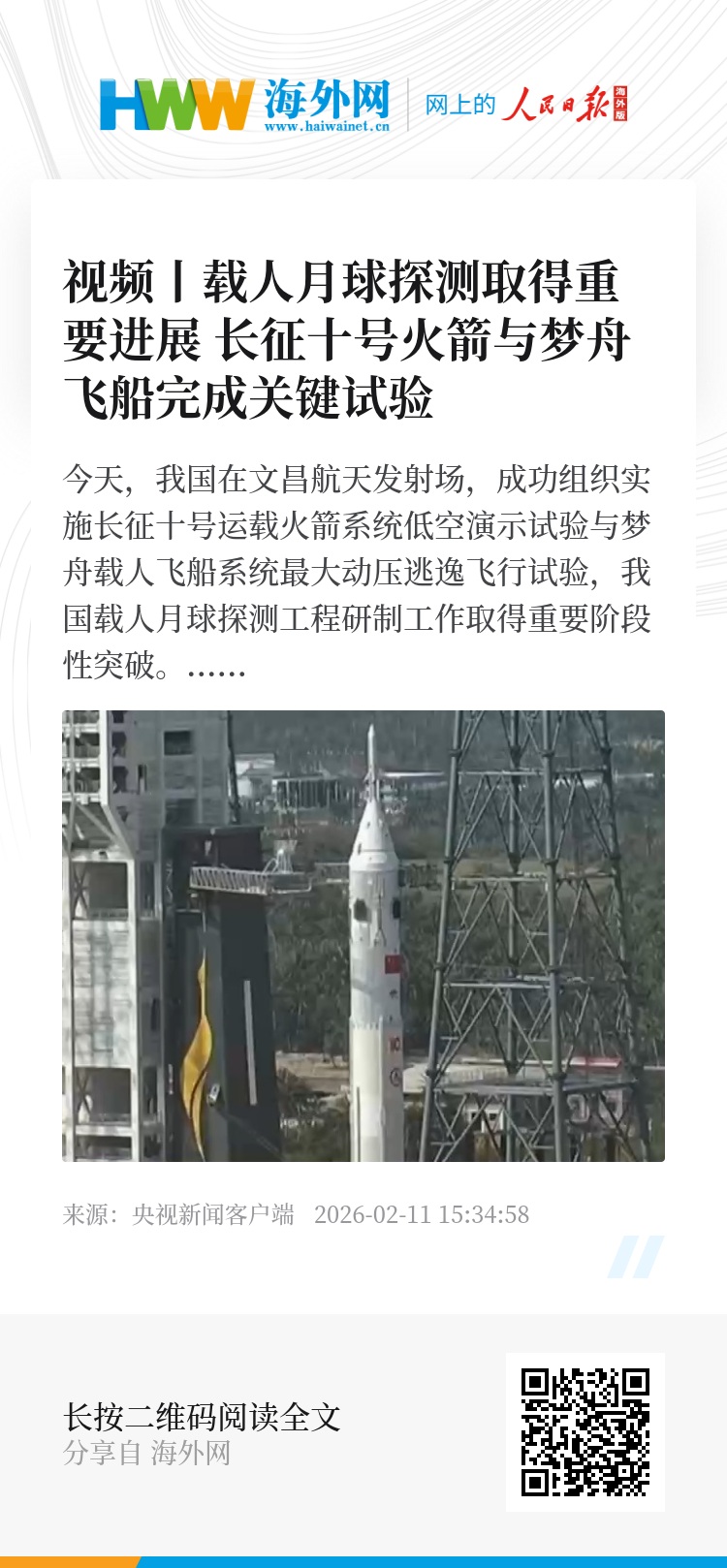 今天,我国在文昌航天发射场,成功组织实施长征十号运载火箭系统低空演示试验与梦舟载人飞船系统最大动压逃逸飞行试验,我国载人月球探测工程研制工作取得重要阶段性突破。