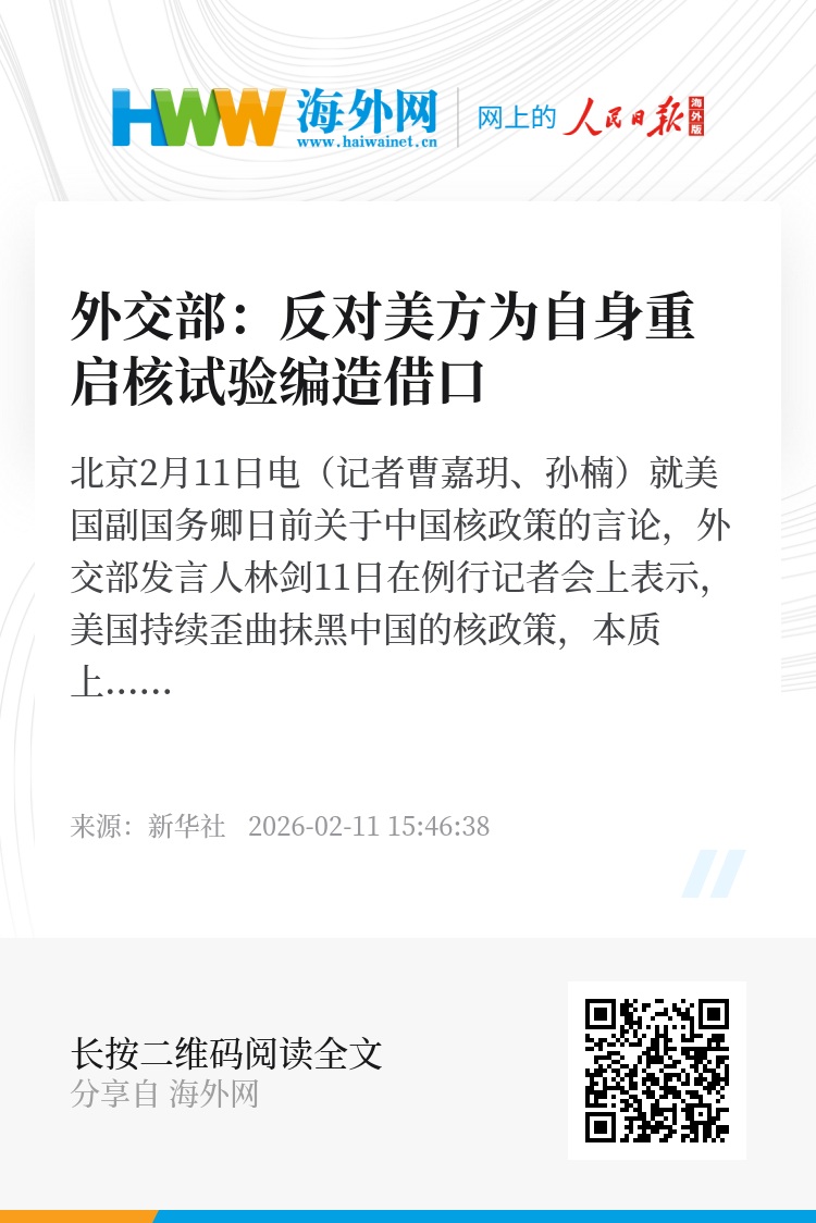 新华社北京2月11日电(记者曹嘉玥、孙楠)就美国副国务卿日前关于中国核政策的言论,外交部发言人林剑11日在例行记者会上表示,美国持续歪曲抹黑中国的核政策,本质上是美国谋求核霸权、推卸自身核裁军责任的政治操弄。中方对此坚决反对。
