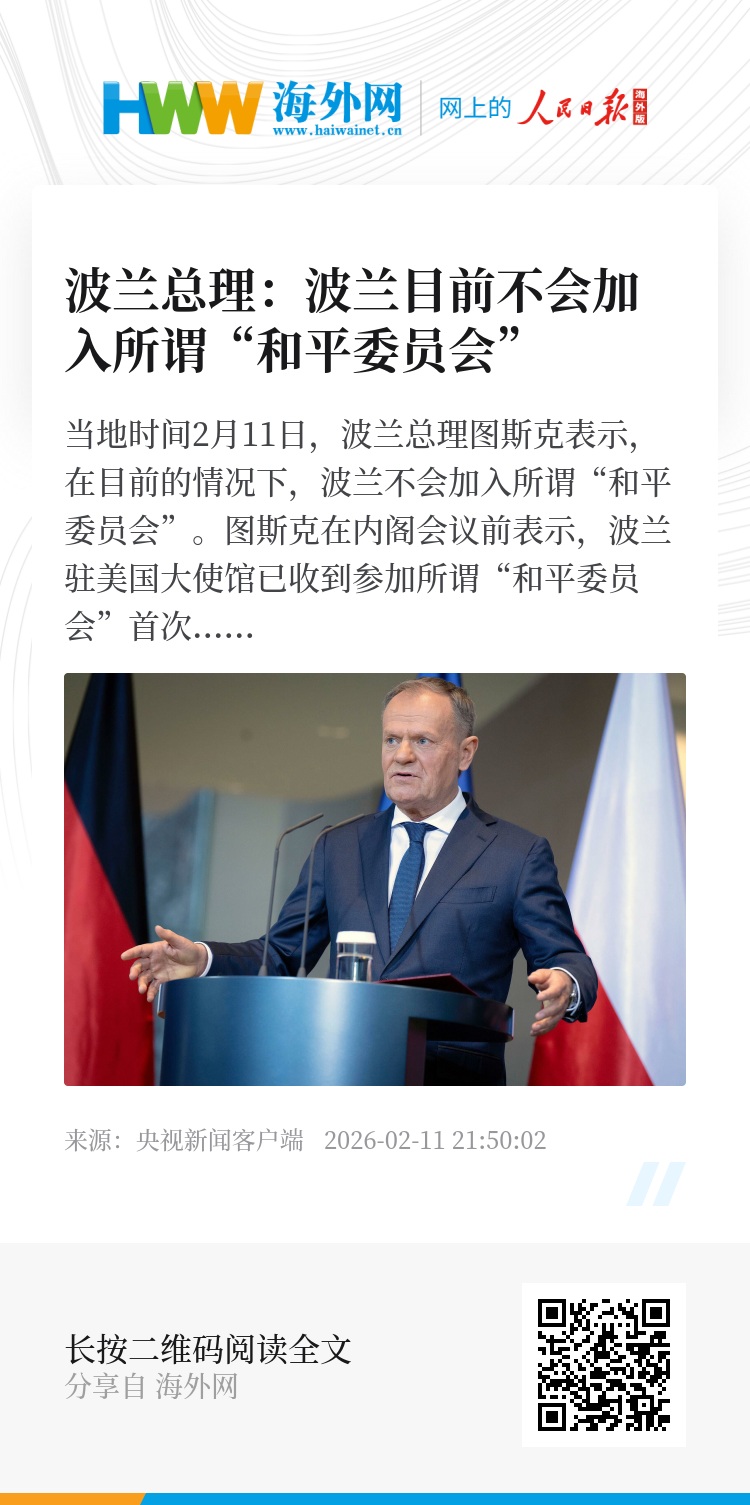 当地时间2月11日,波兰总理图斯克表示,在目前的情况下,波兰不会加入所谓“和平委员会”。