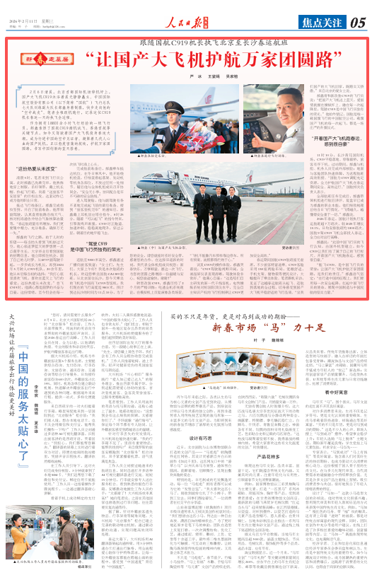 作为拥有18800余小时飞行经验的一级飞行员,郝鑫亲历了国航C919接机试飞、香港首航等关键节点,如今又驾驶着国产大飞机投身春运大潮,成为行进中国的空中见证者。凝聚着几代人心血的国产民机,正以愈发密集的航线,护航万家团圆路,书写中国创新的蓝天答卷。
