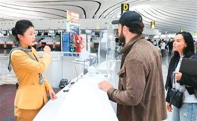 大兴机场工作人员为外籍旅客提供问询服务。