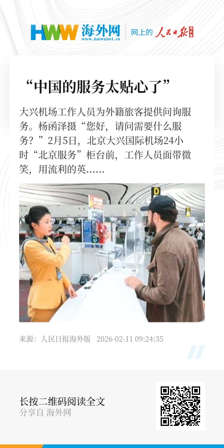 春运大幕下,大兴机场用AI翻译器架起沟通桥梁,用3分钟快速办卡打通出行脉络,用全流程爱心陪伴守护特殊需求,让每一位外籍旅客都能在跨越山海的旅程中,感受到“中国速度”背后的“中国温度”。(李佳宸 魏锦塬 夏乐雄)