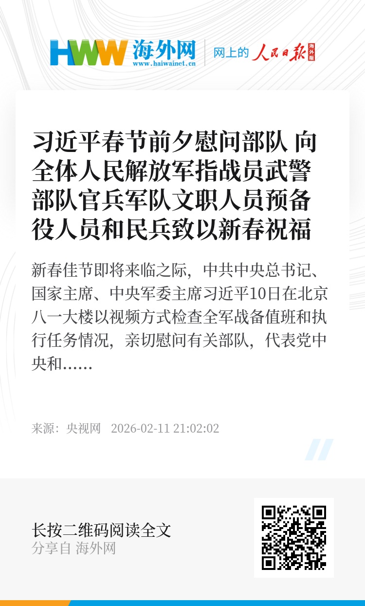 新春佳节即将来临之际,中共中央总书记、国家主席、中央军委主席习近平10日在北京八一大楼以视频方式检查全军战备值班和执行任务情况,亲切慰问有关部队,代表党中央和中央军委,向全体人民解放军指战员、武警部队官兵、军队文职人员、预备役人员和民兵致以诚挚问候和新春祝福。