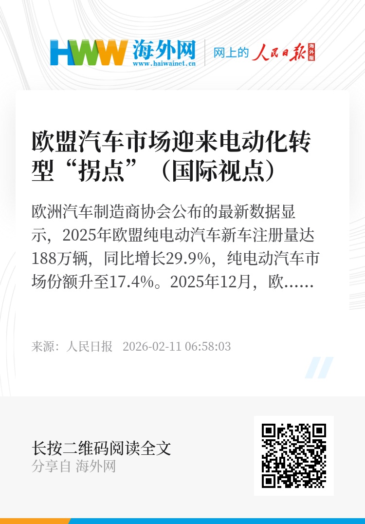 欧洲汽车制造商协会公布的最新数据显示,2025年欧盟纯电动汽车新车注册量达188万辆,同比增长29.9%,纯电动汽车市场份额升至17.4%。2025年12月,欧盟车市迎来历史“拐点”,即纯电动汽车注册量首次超过传统汽油动力汽车,为有记录以来的首次。当前,欧盟汽车市场正加速电动化转型,欧洲汽车制造商积极推动建立电动汽车生产工厂,中欧汽车合作向纵深领域不断拓展。