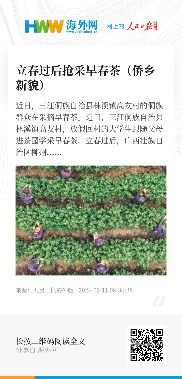 立春过后,广西壮族自治区柳州市三江侗族自治县20多万亩茶园的茶树相继萌发新芽,侗族群众抓紧时间抢采早春茶。因气候原因,三江侗族自治县的早春茶在立春前后即孕育萌发,比其他绿茶产区要早7至20天上市。