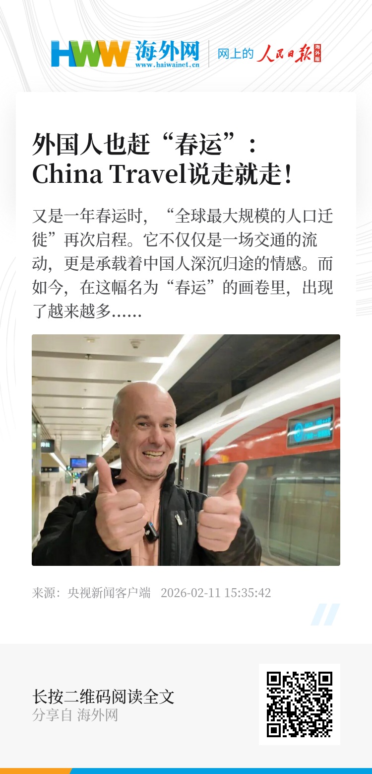 从外国友人的目光看去,春运已不仅是一场交通现象,从绿皮车的记忆到如今风驰电掣的“中国速度”,这是中国社会发展的生动特写。年复一年,这场以“流动”为名的迁徙,也因高铁这张“国家名片”,成为世界观察当代中国的一扇真实而开放的窗口。