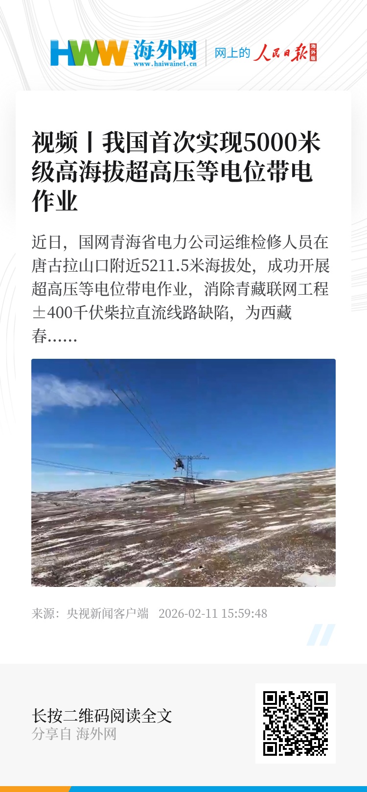 此次作业刷新世界超高压带电作业海拔纪录,也是我国首次在五千米级高海拔区域开展此类作业。作为连接青藏的 “电力天路”,青藏联网工程2011年底投运后,解决了西藏冬季缺电、夏季水电消纳难的问题,其中柴拉直流段平均海拔超4000米,运维难度极大。此次作业彰显了我国极端环境下的电网运维实力,为当地民生保障和经济发展提供了坚强电力支撑。