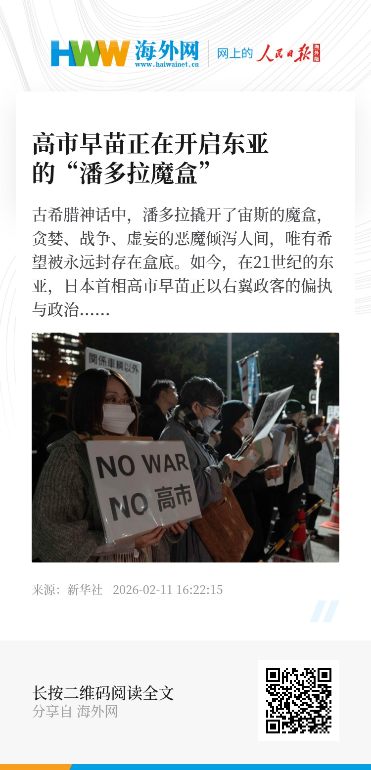 如今,在21世纪的东亚,日本首相高市早苗正以右翼政客的偏执与政治野心,成为新时代的“潘多拉”。她在2026年日本众议院选举的胜势加持下,可能亲手撬开日本尘封已久的“潘多拉魔盒”,将修宪、扩军、篡史三大恶魔释放出来。这些恶魔将撕碎战后和平的封印,践踏世界反法西斯战争胜利的法理底线,让日本的右倾化狂飙成为实实在在的威胁,也让国际社会直面日本军国主义死灰复燃的严峻危机。其突破战后秩序约束的每一步,都在将地区和平推向未知的危险边缘。