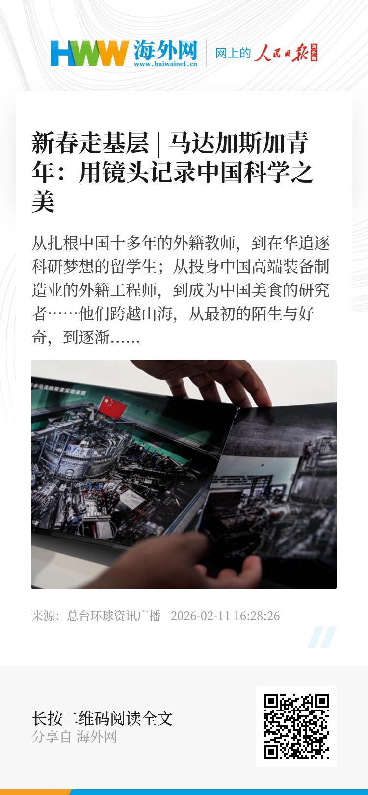 十年,足以让一位跨越山海的求学者,深深扎根于一片土地,并成为它澎湃创新史诗的见证者与记录者。他镜头下的每一帧画面,都凝结着中国科学家“敢为天下先”的创新精神。