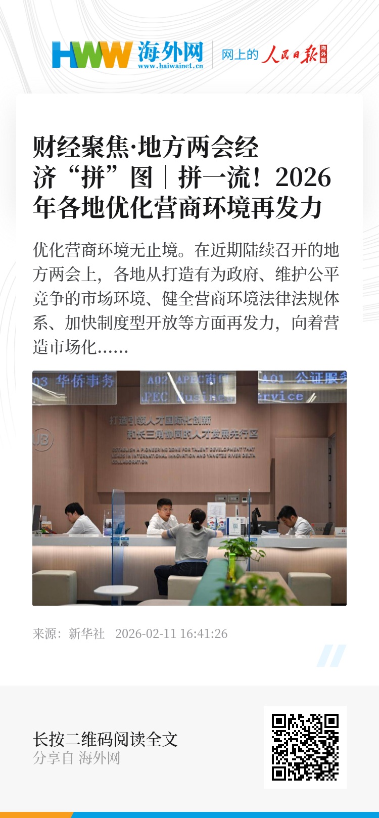 上海明确,实施优化营商环境2026年行动方案,在政务服务、市场竞争、产业生态等领域推出一批创新举措,深化世行评估对标改革,进一步为企业减负增效。广东提出,全面对照世界银行评估标准,经常性梳理排查,不断完善提升,积极建设更具国际竞争力的营商环境;构建与国际接轨的制度型开放体系,提升境外企业和个人工作生活的便利性,努力实现商品、资本和人才的跨境便捷流动。