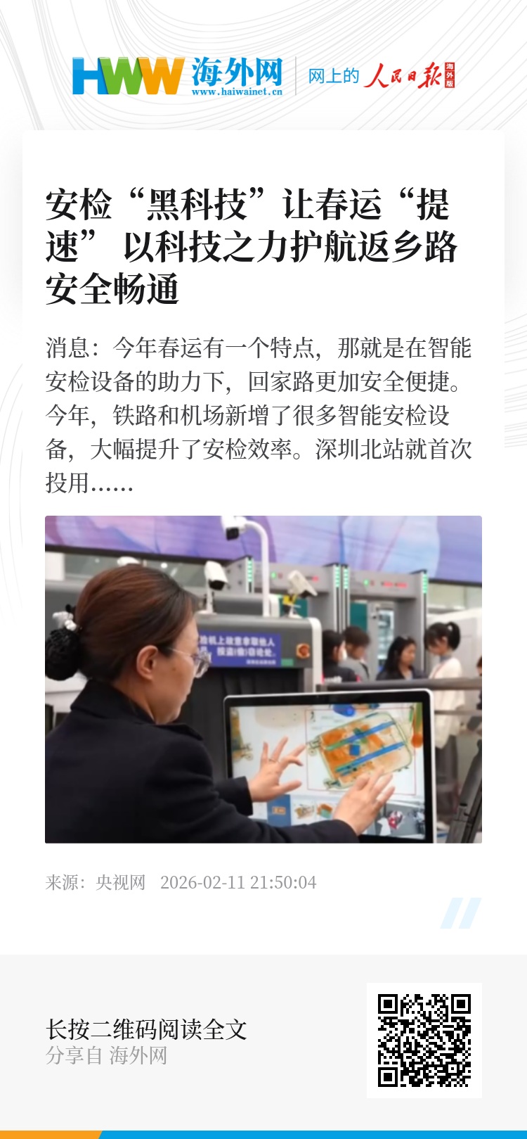 央视网消息:今年春运有一个特点,那就是在智能安检设备的助力下,回家路更加安全便捷。今年,铁路和机场新增了很多智能安检设备,大幅提升了安检效率。深圳北站就首次投用了AI智能安检系统。