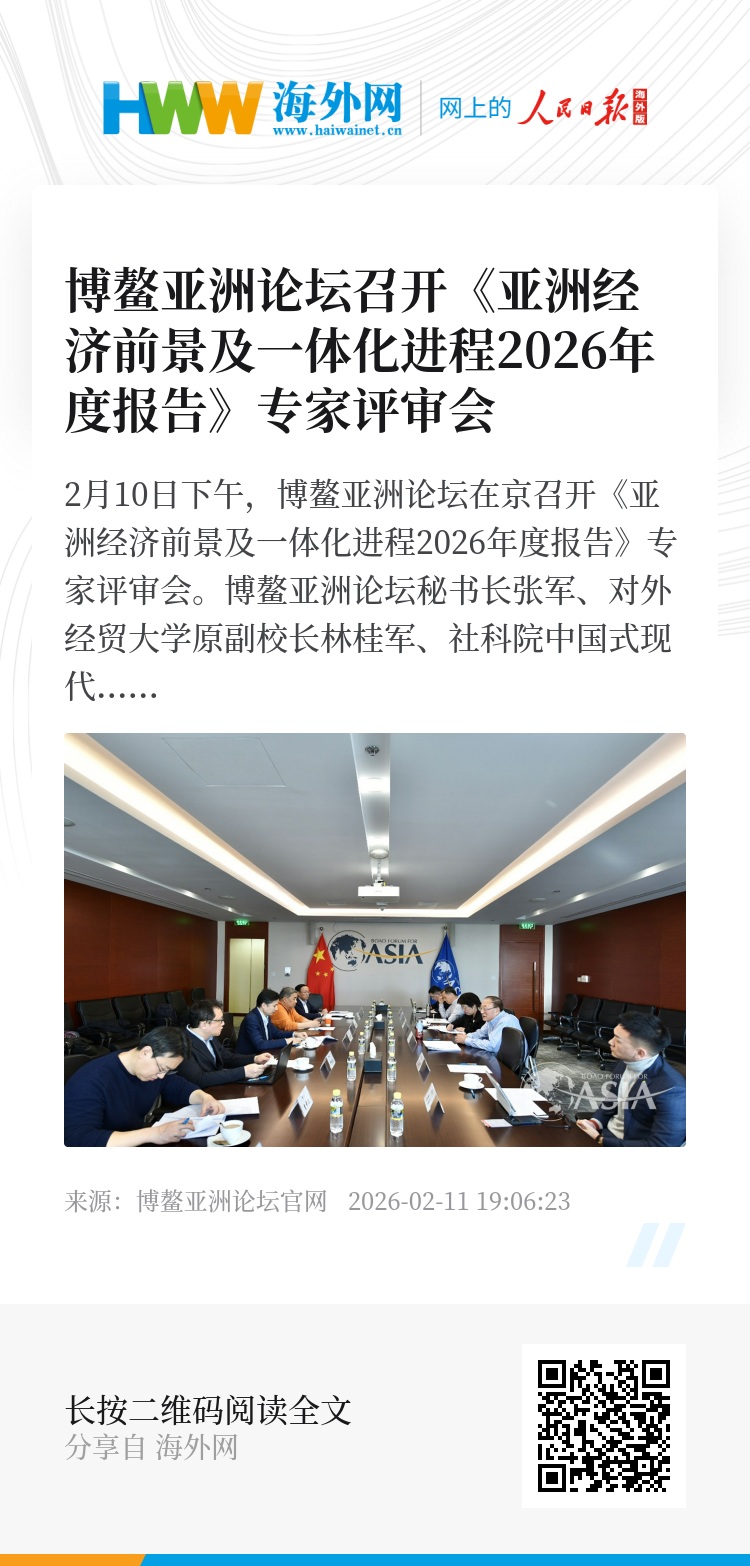 2月10日下午,博鳌亚洲论坛在京召开《亚洲经济前景及一体化进程2026年度报告》专家评审会。博鳌亚洲论坛秘书长张军、对外经贸大学原副校长林桂军、社科院中国式现代化研究院副院长徐秀军、中国社科院亚太与全球战略研究院副院长沈铭辉、对外经贸大学国际经济贸易学院院长唐宜红、德勤人工智能研究院主管合伙人范为、德勤研究总监钟昀泰等专家学者出席。博鳌亚洲论坛研究院副院长洪斌主持会议。