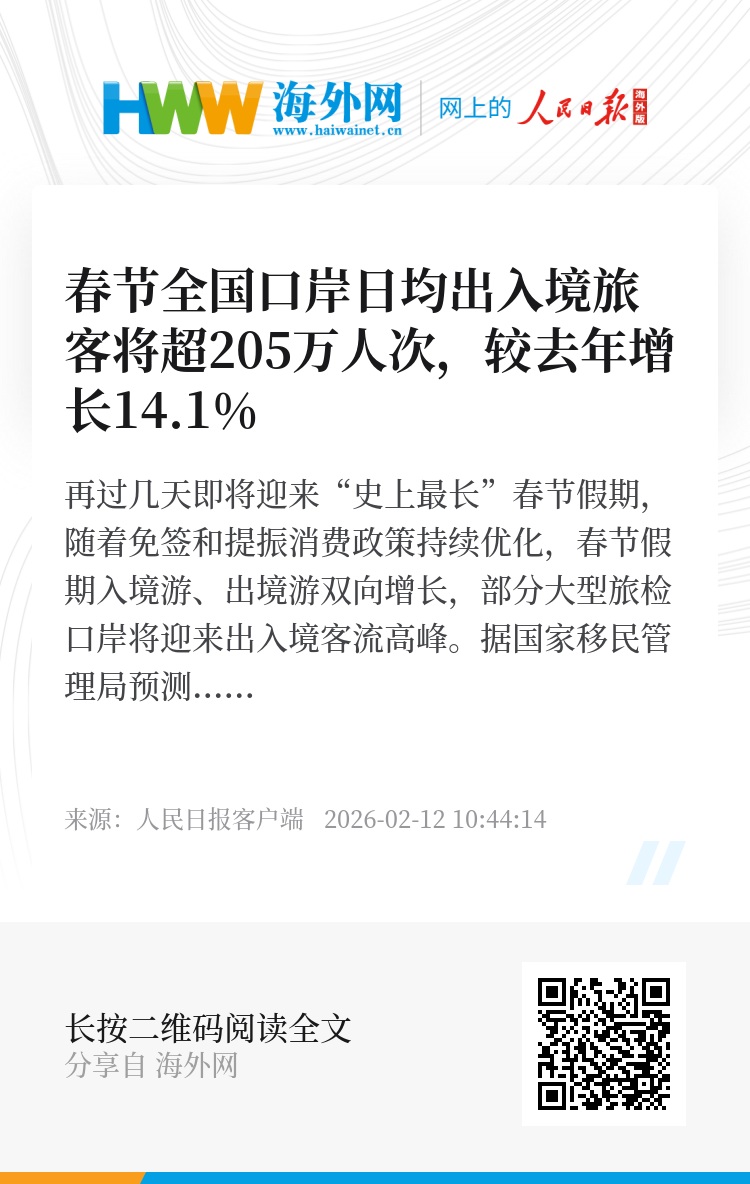 再过几天即将迎来“史上最长”春节假期,随着免签和提振消费政策持续优化,春节假期入境游、出境游双向增长,部分大型旅检口岸将迎来出入境客流高峰。据国家移民管理局预测,今年春节假期全国口岸日均出入境旅客将超过205万人次,较去年春节假期增长14.1%,其中,大型空港口岸出入境客流增长明显,预计出境客流高峰将集中在2月15日(腊月二十八),入境客流高峰将集中在2月22日至23日(正月初六至初七),上海浦东、广州白云、北京首都、成都天府、深圳宝安等机场日均出入境客流预计分别为10.4万、5.7万、4.3万、2.1万、1.8万人次;毗邻港澳陆路口岸客流相对平稳,预计客流高峰将集中在2月18日至19日(正月初二至初三),深圳罗湖、福田、深圳湾、广深港高铁西九龙站、莲塘口岸预计日均出入境旅客分别为20.9万、18.2万、15.7万、11.2万、9.3万人次,珠海拱北、港珠澳大桥、横琴、青茂口岸日均出入境旅客预计分别为30.8万、12.7万、9.9万、9.8万人次。