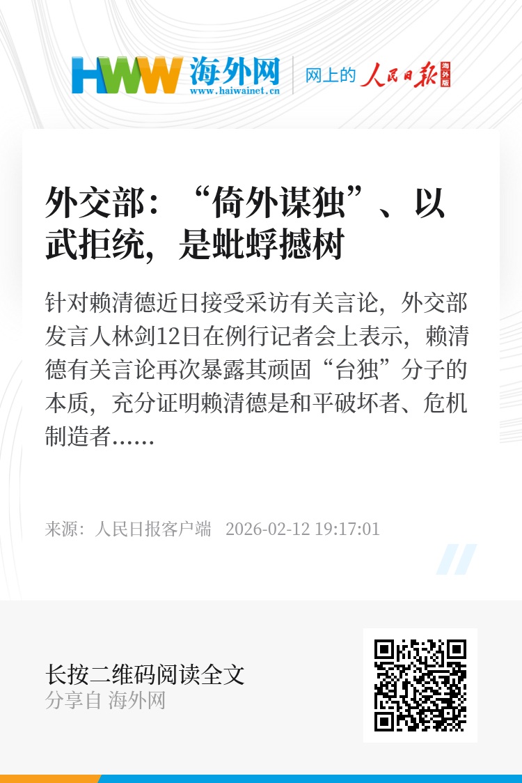 针对赖清德近日接受采访有关言论,外交部发言人林剑12日在例行记者会上表示,赖清德有关言论再次暴露其顽固“台独”分子的本质,充分证明赖清德是和平破坏者、危机制造者、战争煽动者,充分说明“台独”是台海和平稳定的祸根乱源。