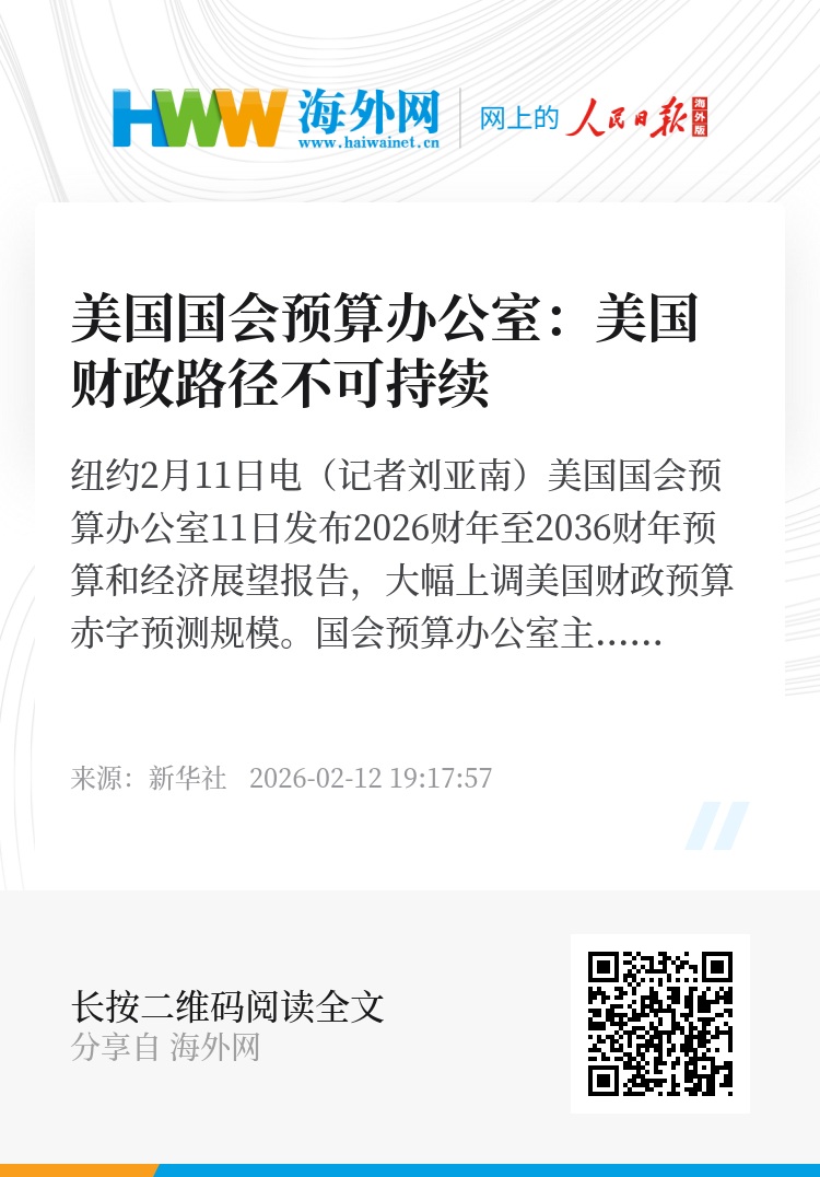新华社纽约2月11日电(记者刘亚南)美国国会预算办公室11日发布2026财年至2036财年预算和经济展望报告,大幅上调美国财政预算赤字预测规模。国会预算办公室主任菲利普·斯瓦戈尔当天警告,相关预测显示美国财政路径“不可持续”。