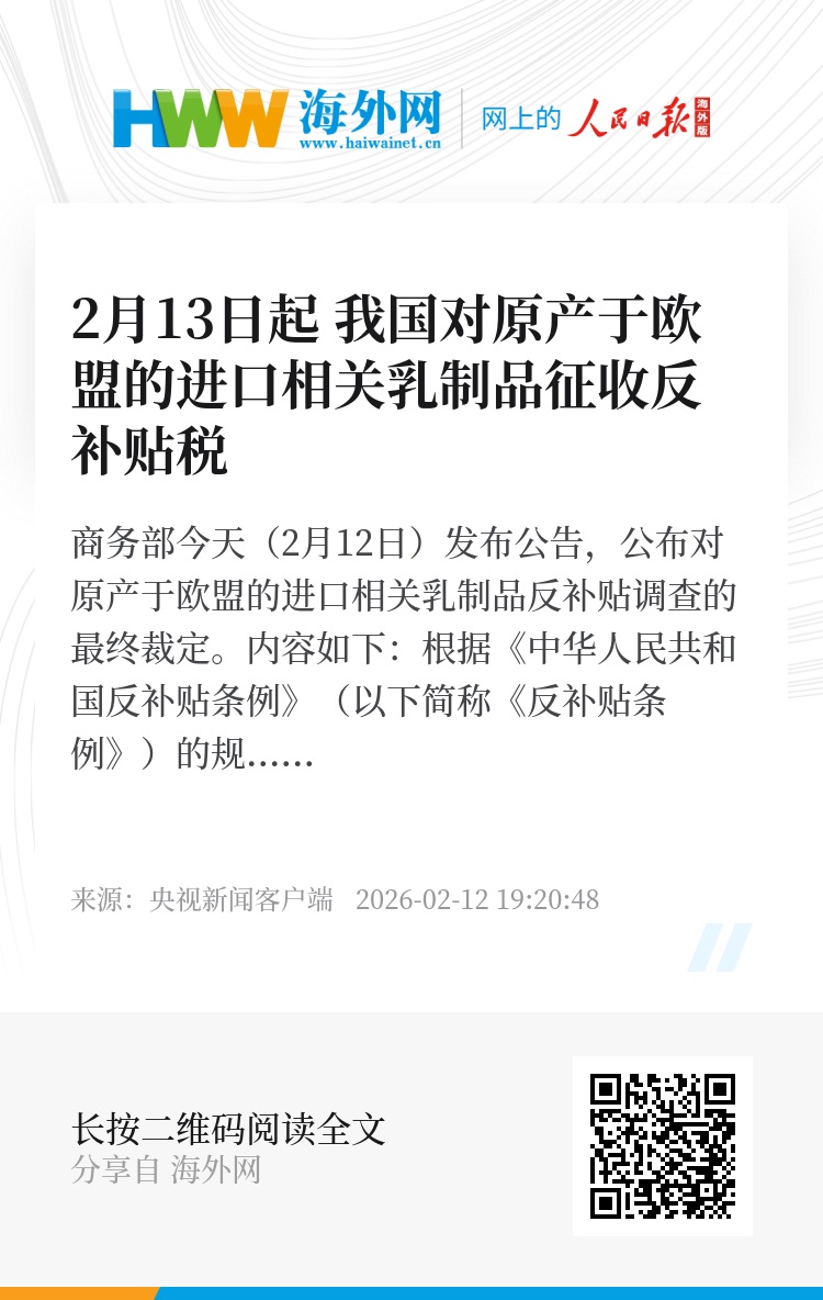 对原产于欧盟的进口相关乳制品征收反补贴税的实施期限自2026年2月13日起5年。