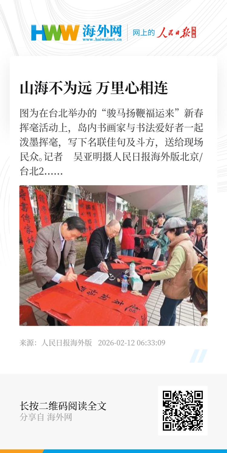 在北京,“同心同行 共启新程”2026年在京台胞新春联谊活动近日举办,近200名台胞欢聚一堂,互致新年问候。在现场,书法家与台胞们共同绘“福”,红纸黑字间流淌着共同的文化记忆。当《阿里山的姑娘》旋律响起,不少台胞轻声和唱,相声《恭贺新禧》则将两岸共同的年俗化为欢声笑语。