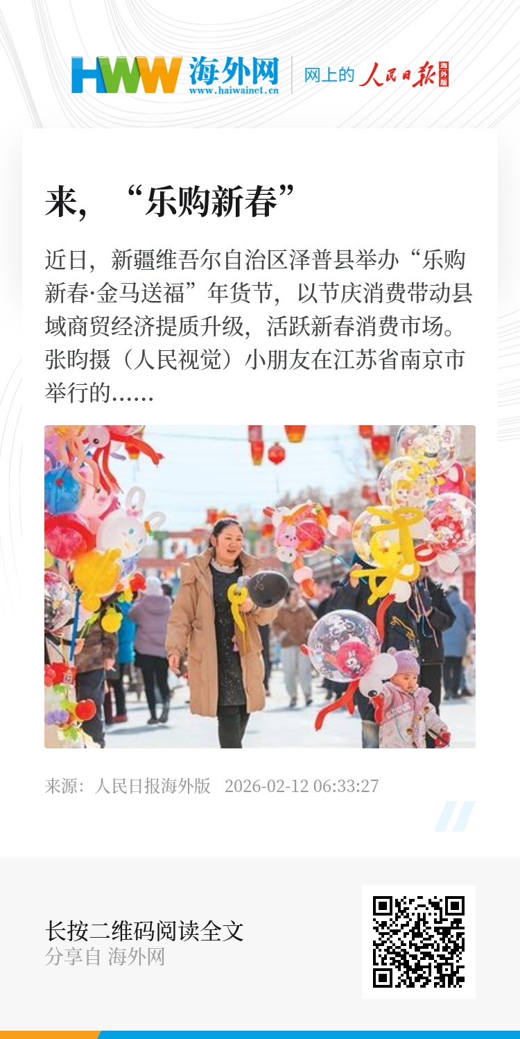 市场人士预计,“乐购新春”将成为2026年开年消费的一个新高潮。纵观全年,随着提振消费政策深入实施,居民消费能力不断增强,消费多元化场景创新发展,消费市场扩容提质态势将持续巩固。(王俊岭 刘博宁)