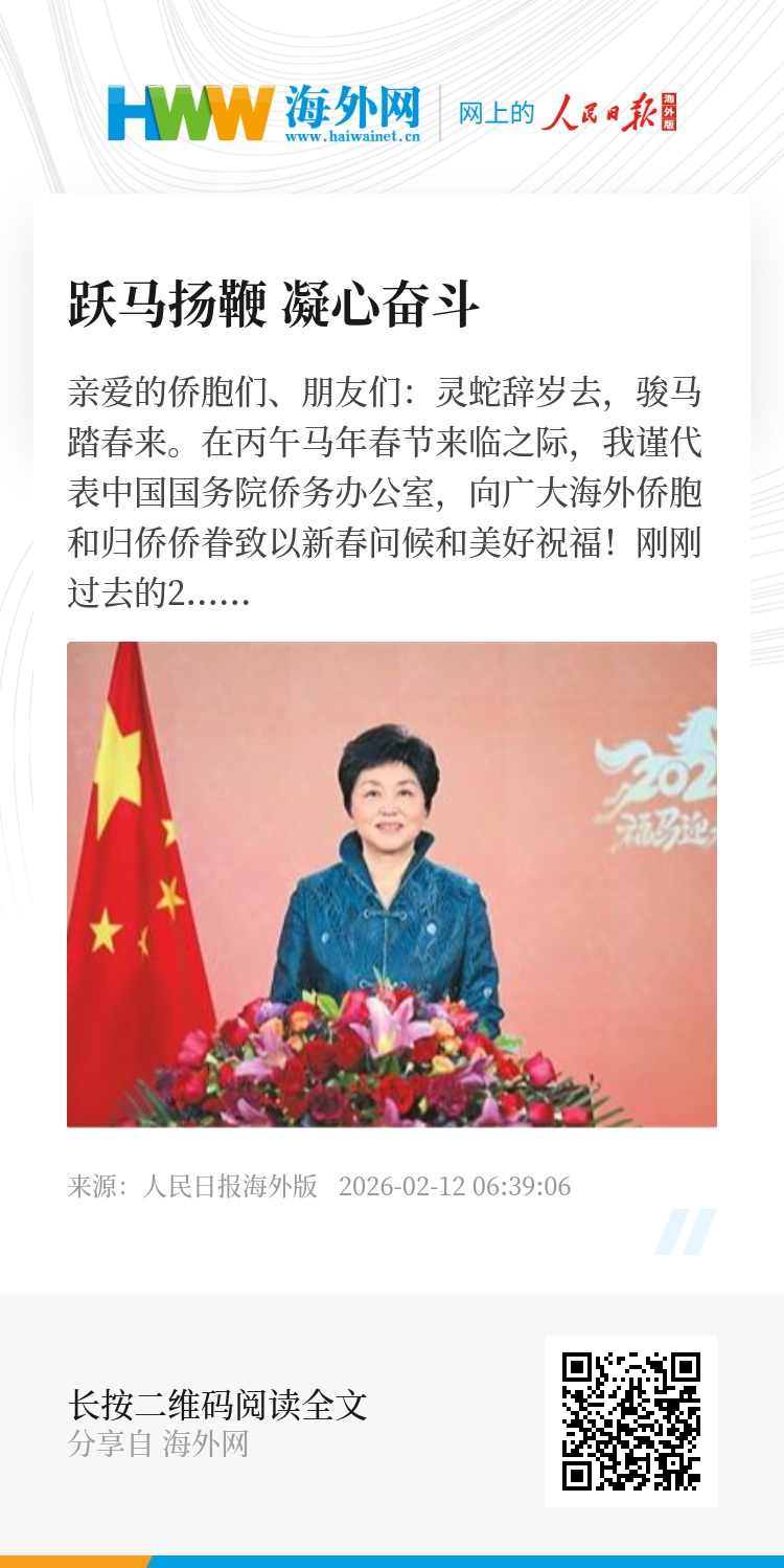 2026年是“十五五”开局之年。我们将继续坚持“以人为本,为侨服务”宗旨,全面贯彻落实侨务政策,竭诚深化为侨服务,共同画好海内外中华儿女最大同心圆,凝聚起中华民族伟大复兴的磅礴伟力。我诚挚地邀请侨胞们常回家看看,饱览祖(籍)国锦绣山河,感受各地风土人情和时代新貌,看看贺兰山下、滇藏线旁,不仅有塞上江南、雪山峡谷的壮丽奇观,更有各民族团结进步、中华民族一家亲的生动景象;洞庭湖畔、寒山寺外,不仅有烟波浩渺、枫桥乌啼的四时风光,更有寻常百姓多姿多彩、烟火升腾的生活气息。也希望侨胞们以多种方式向住在国亲朋好友、各界人士,讲讲美丽中国、家乡的故事,让世界更了解中国、了解中华民族,助力中外文化文明交流互鉴。