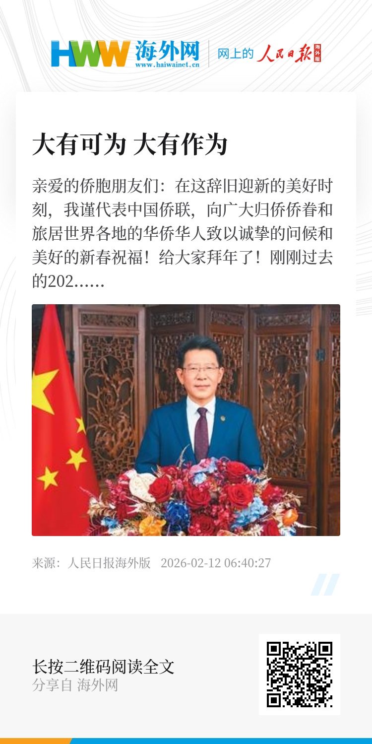 2026年是“十五五”规划的开局之年。站在新的历史起点,国家将锚定高质量发展首要任务,全面深化改革开放,扎实推进共同富裕,奋力谱写中国式现代化新篇章。新征程上,广大侨胞大有可为,也必将大有作为。