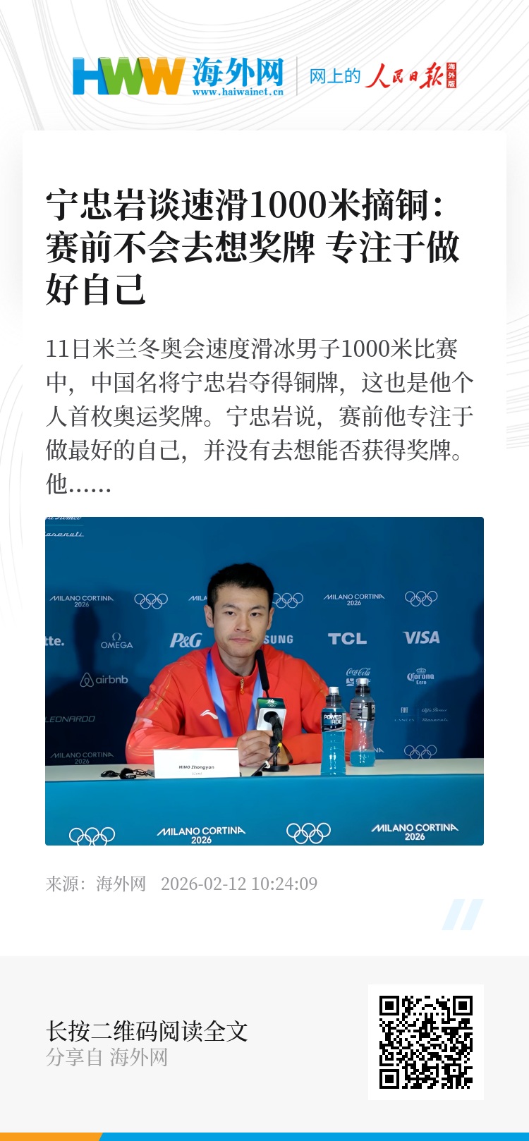 11日米兰冬奥会速度滑冰男子1000米比赛中,中国名将宁忠岩夺得铜牌,这也是他个人首枚奥运奖牌。宁忠岩说,赛前他专注于做最好的自己,并没有去想能否获得奖牌。他将以1500米比赛为主项,全力以赴,以沉稳的心态发挥出最好的状态。(记者 刘峣)