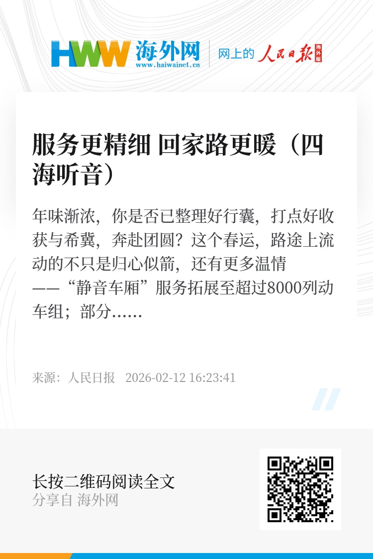 这个春运,路途上流动的不只是归心似箭,还有更多温情——“静音车厢”服务拓展至超过8000列动车组;部分列车将餐车等区域临时改造成“遛娃舱”,摆上绘本、积木;全国110个高铁站、170趟高铁列车为乘客办理、提供宠物托运服务,让带“毛孩子”回家过年更安全、更便捷。这些微创新,让旅途更从容。