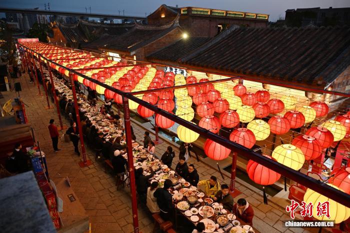 中新网福建晋江2月11日电(记者 孙虹)正值中国南方小年,有着百年历史的福建晋江梧林传统村落11日晚摆起长桌,逾两百名海内外游客、侨胞以及当地劳动者于此间共享团圆宴,沉浸式体验闽南年味。