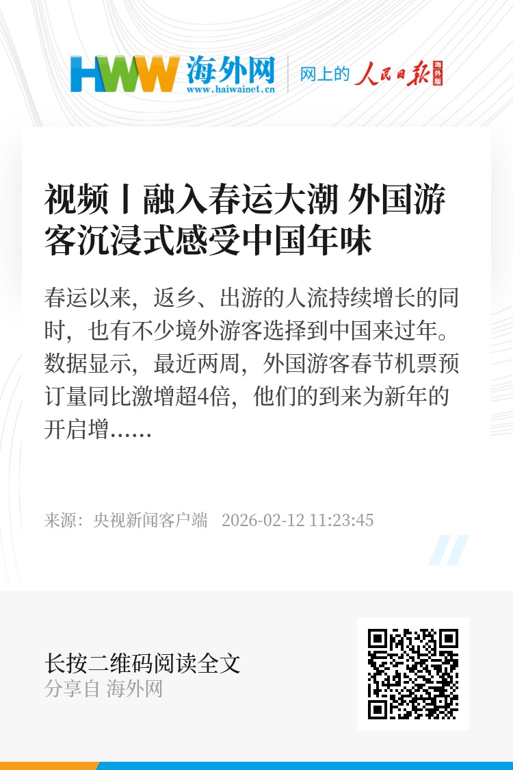 数据显示,最近两周,外国游客春节机票预订量同比激增超4倍,他们的到来为新年的开启增添了一抹独特的色彩,也为世界了解中国打开了一扇生动的窗口。