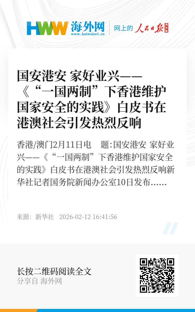 新华社香港/澳门2月11日电 题:国安港安 家好业兴——《“一国两制”下香港维护国家安全的实践》白皮书在港澳社会引发热烈反响