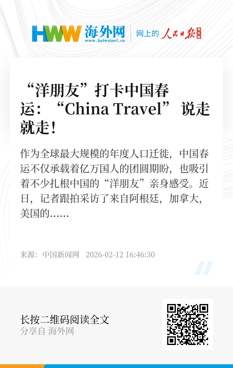 作为全球最大规模的年度人口迁徙,中国春运不仅承载着亿万国人的团圆期盼,也吸引着不少扎根中国的“洋朋友”亲身感受。近日,记者跟拍采访了来自阿根廷,加拿大,美国的几位旅客,他们沉浸式“解锁”中国春运,在熙攘人潮中体验中国年味,更频频点赞中国高铁的硬核实力。