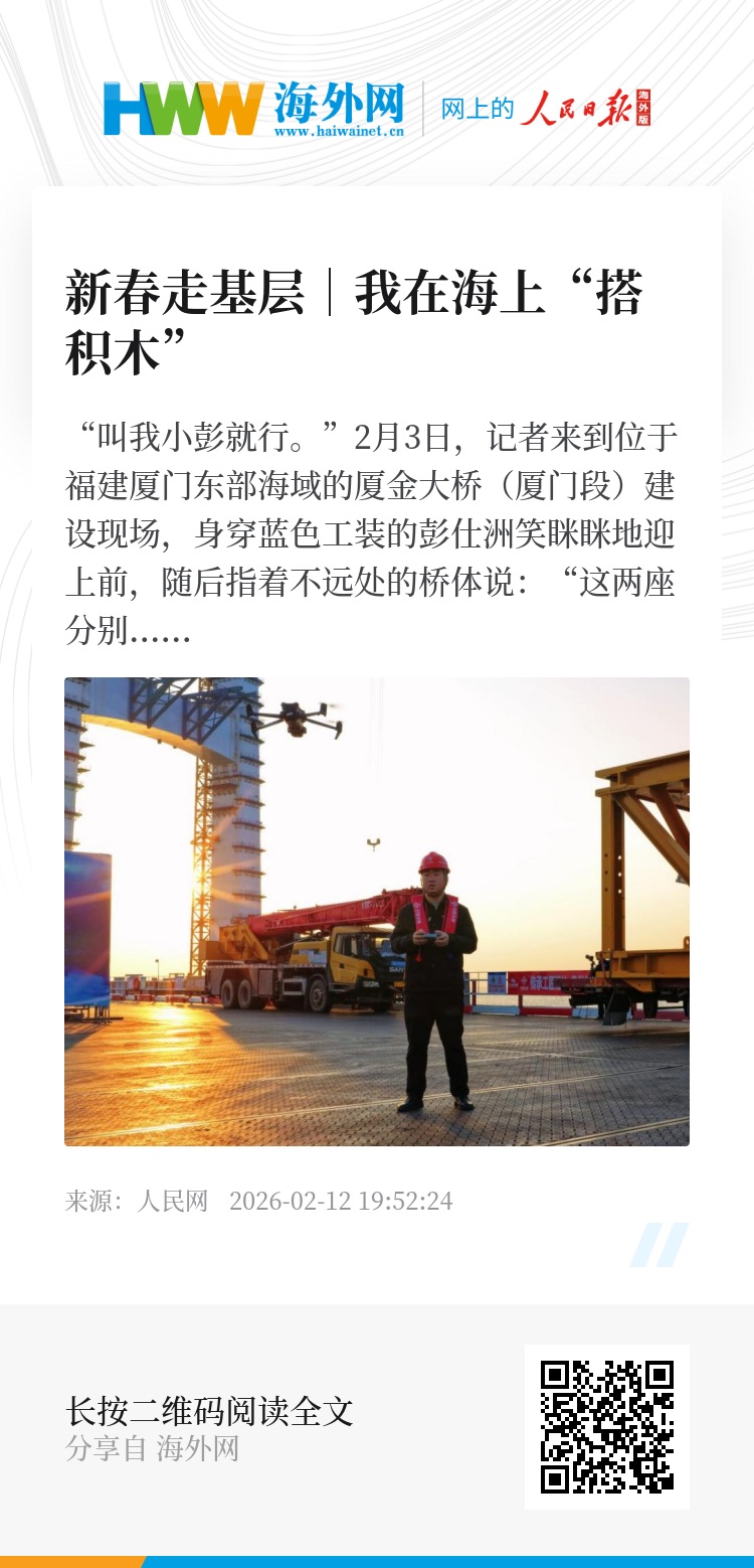 “叫我小彭就行。”2月3日,记者来到位于福建厦门东部海域的厦金大桥(厦门段)建设现场,身穿蓝色工装的彭仕洲笑眯眯地迎上前,随后指着不远处的桥体说:“这两座分别是东西主塔,去年底刚封顶。”