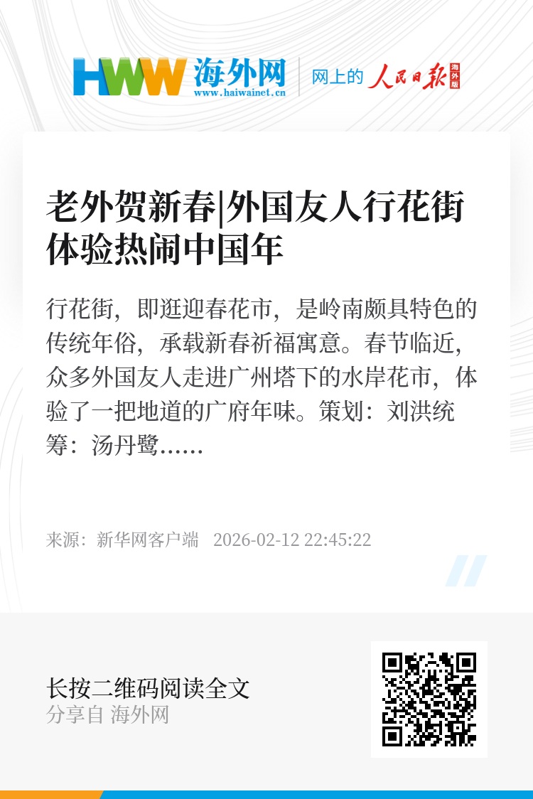 行花街,即逛迎春花市,是岭南颇具特色的传统年俗,承载新春祈福寓意。春节临近,众多外国友人走进广州塔下的水岸花市,体验了一把地道的广府年味。
